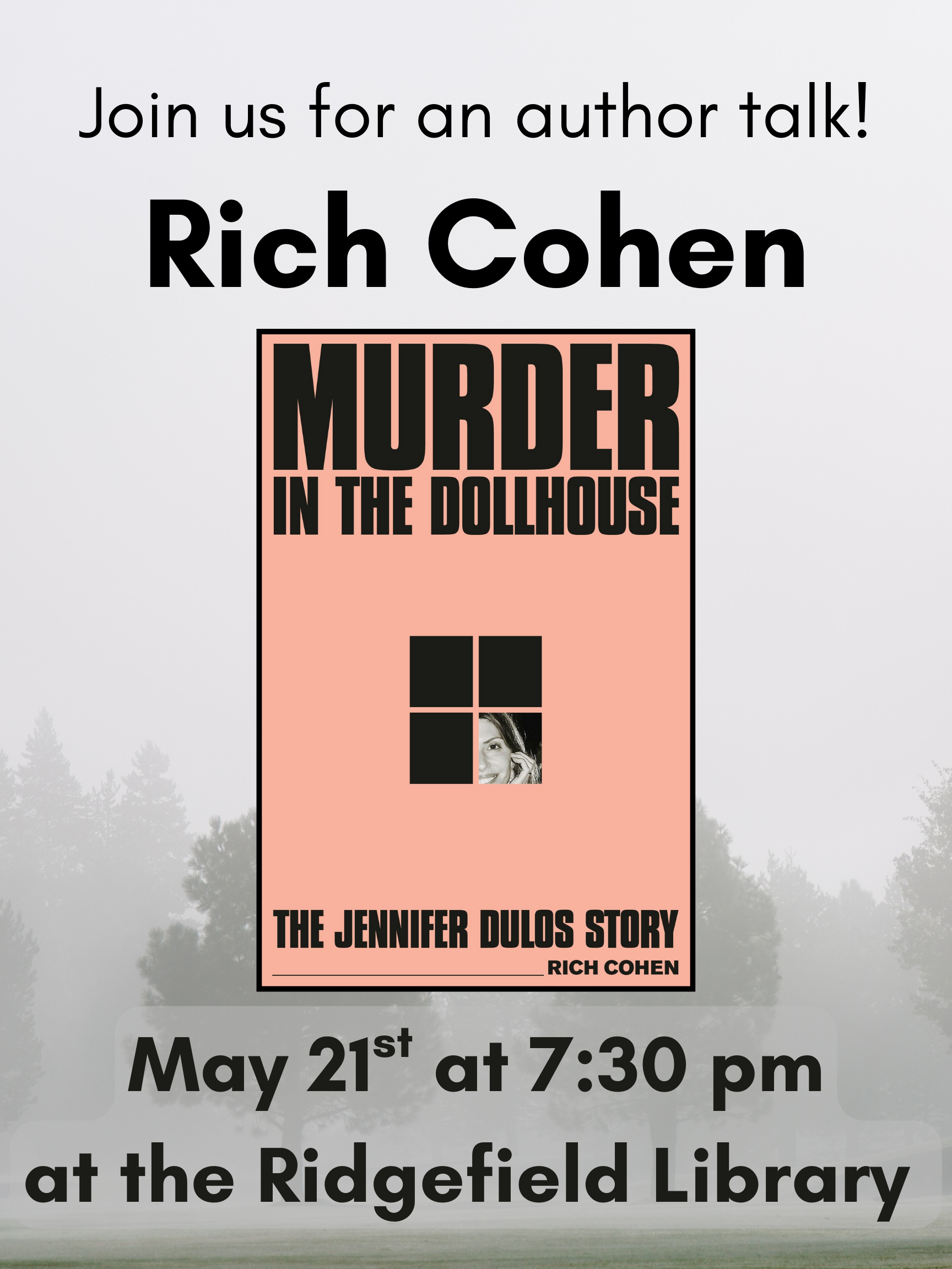 Join us for an author talk, Wednesday, May 21st at 7:30pm at the Ridgefield Library! Hear from New York Times bestselling author Rich Cohen and his latest book, releasing May 20th, Murder in the Dollhouse. Books will be available for purchase and signing.